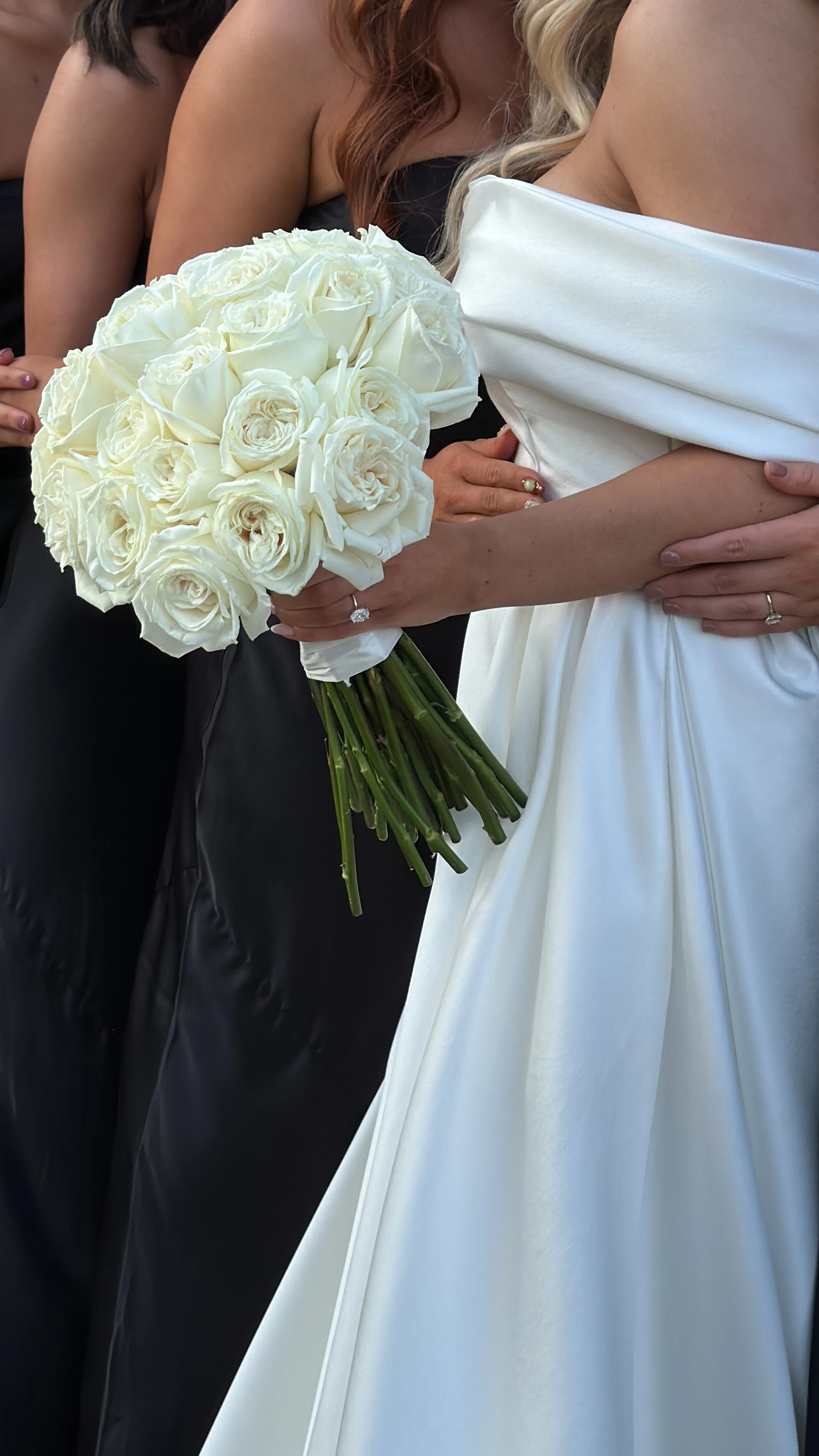 A bride in a white wedding dress holding a bouquet of white roses, with Bridesmaids in black dresses standing nearby.